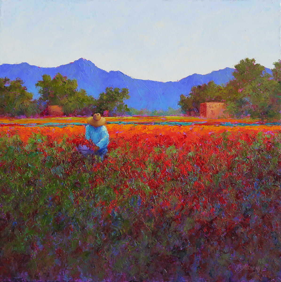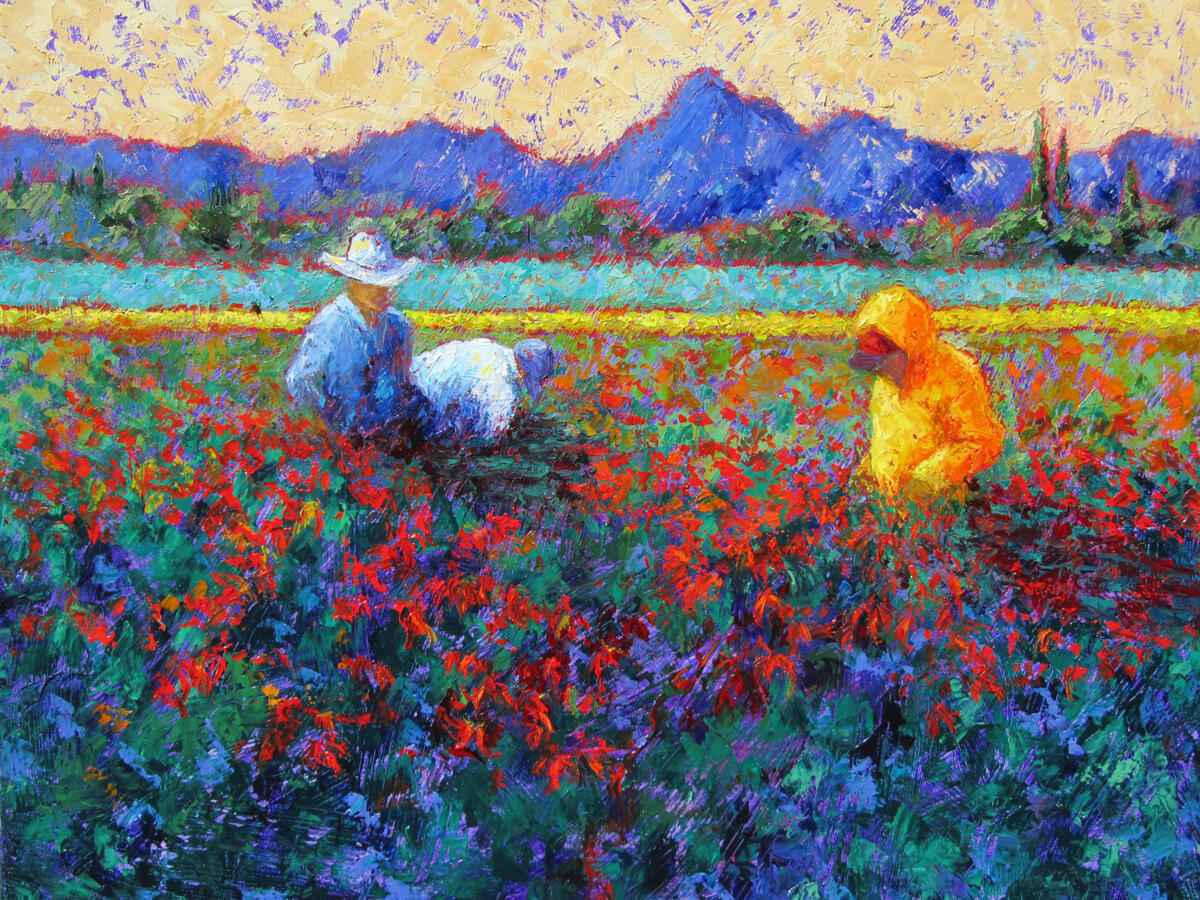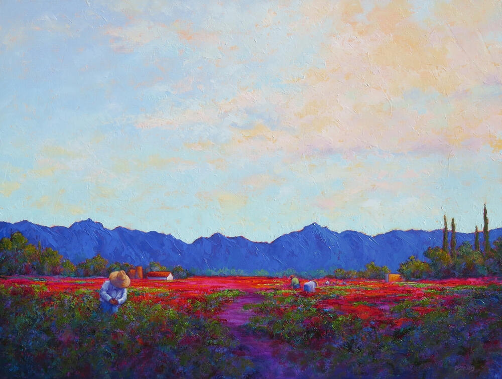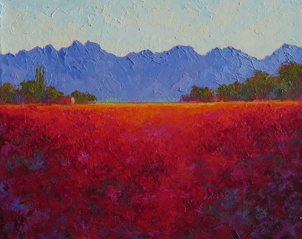 My emotional reaction to the intense light and color of the western landscape inspires me to paint, expressing the joy and life I feel in vivid color and texture. The agricultural lands of the Rio Grande valley have a special place in my heart because I grew up on a small family-run farm. My paintings seek to honor the people who work close to the earth and revere the land that sustains them.Oil paint is my chosen tool to express this vivid landscape. I apply thick glossy paint over glowing transparent washes, a technique gleaned from my experiences as a watercolorist and glass artist. Layering contrasting and complimentary tones next to each other in thick, bold strokes over these transparent passages make the image shimmer and dance with color. These complex layers mixing and mingling in the viewer's eye creates effects of light similar to those of Pointillism with the contemporary twist of application with a palette knife.For me, painting is about the joy of color and texture; I paint my feelings about the place rather than a strict interpretation of reality. The landscape provides the representational basis for the abstracted play of color in the paint surfaces I create. "To surprise the hungry eye", poet John O'Donahue's phrase from The Artist at the Start of Day, expresses my desire to create visual surprise and delight, to speak to the eye and soul of the viewer hungry for beauty. That magic between the painter, the painting and the viewer is my ultimate goal.